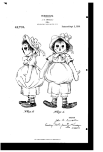Raggedy Ann dolls were patented by John Gruelle in 1915. He received patent D47,789. He wrote at least 50 Raggedy Ann and Andy books to accompany the dolls.